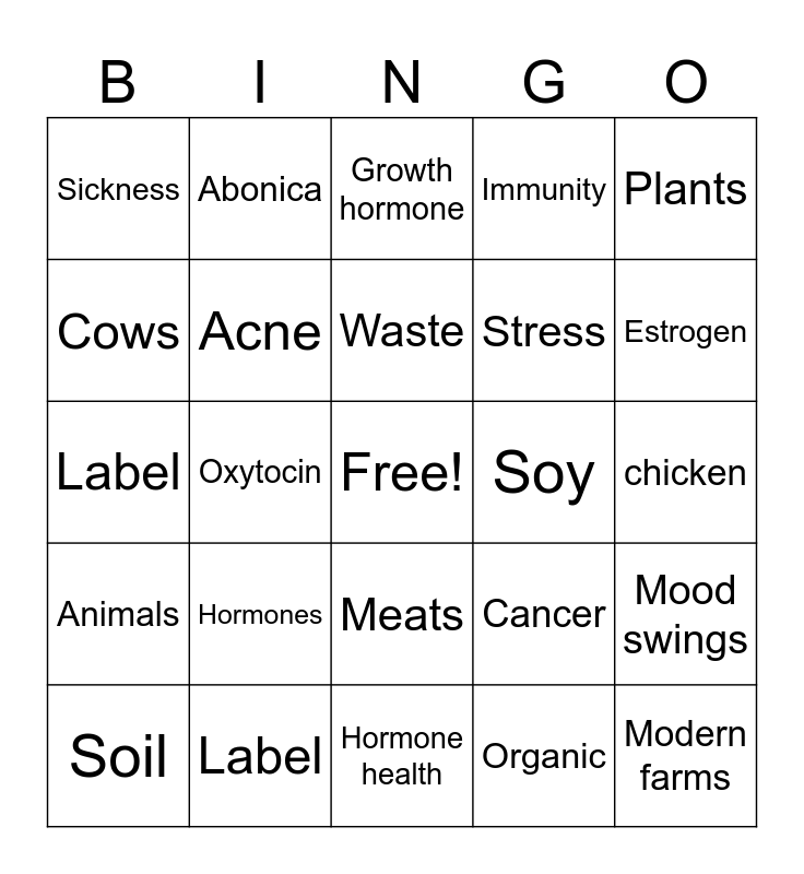 This bingo card has a free space and 24 words: Hormones, Label, Waste, Soil, Plants, Sickness, Cows, Abonica, Soy, Meats, Stress, Label, Cancer, Mood swings, Acne, Organic, chicken, Growth hormone, Estrogen, Oxytocin, Modern farms, Animals, Immunity and Hormone health.