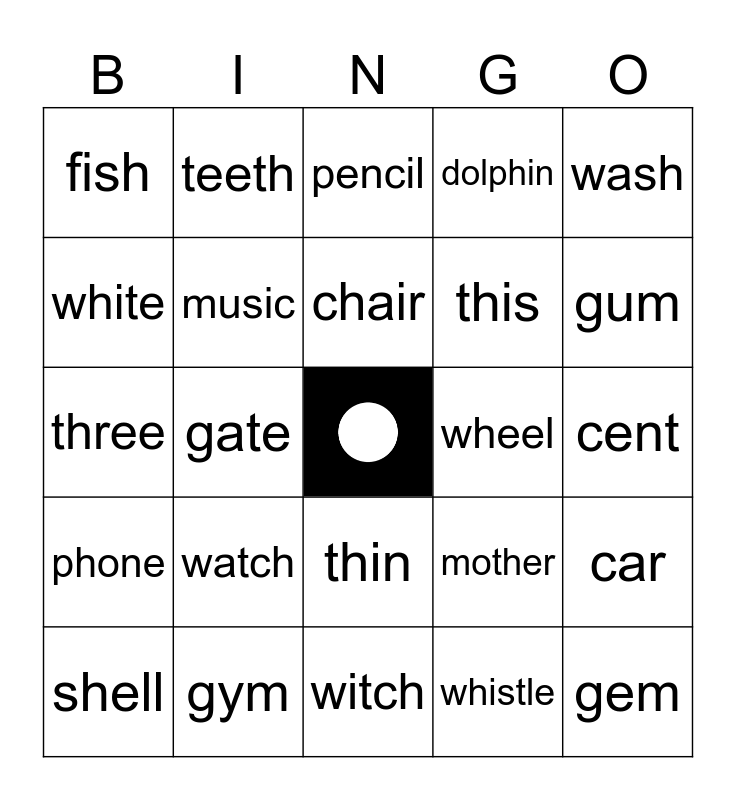 This bingo card has a free space and 25 words: watch, witch, chair, shell, wash, fish, white, teeth, wheel, thin, this, three, mother, car, music, candy, cent, pencil, gum, gate, gem, gym, phone, dolphin and whistle.