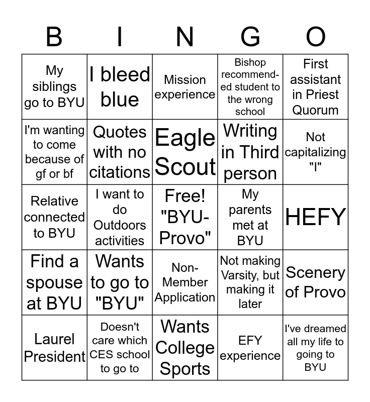 This bingo card has a free space and 24 words: Wants to go to "BYU", Doesn't care which CES school to go to, Eagle Scout, Laurel President, First assistant in Priest Quorum, My siblings go to BYU, I'm wanting to come because of gf or bf, I bleed blue, My parents met at BYU, Non-Member Application, Writing in Third person, Relative connected to BYU, Not making Varsity, but making it later, Scenery of Provo, Quotes with no citations, EFY experience, HEFY, Mission experience, Not capitalizing "I", I want to do Outdoors activities, I've dreamed all my life to going to BYU, Find a spouse at BYU, Bishop recommend-ed student to the wrong school and Wants College Sports.