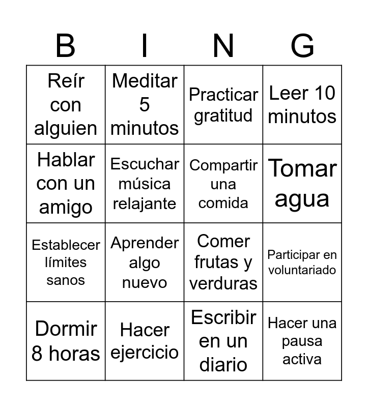 This bingo card has 16 words: Dormir 8 horas, Hacer ejercicio, Practicar gratitud, Leer 10 minutos, Hablar con un amigo, Meditar 5 minutos, Comer frutas y verduras, Participar en voluntariado, Reír con alguien, Escuchar música relajante, Escribir en un diario, Tomar agua, Establecer límites sanos, Aprender algo nuevo, Compartir una comida and Hacer una pausa activa.