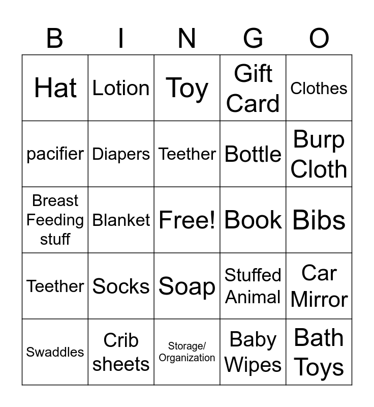 This bingo card has a free space and 24 words: Socks, Crib sheets, Teether, Swaddles, Clothes, Hat, pacifier, Lotion, Book, Soap, Bottle, Breast Feeding stuff, Stuffed Animal, Car Mirror, Diapers, Baby Wipes, Bibs, Toy, Burp Cloth, Blanket, Bath Toys, Teether, Gift Card and Storage/ Organization.