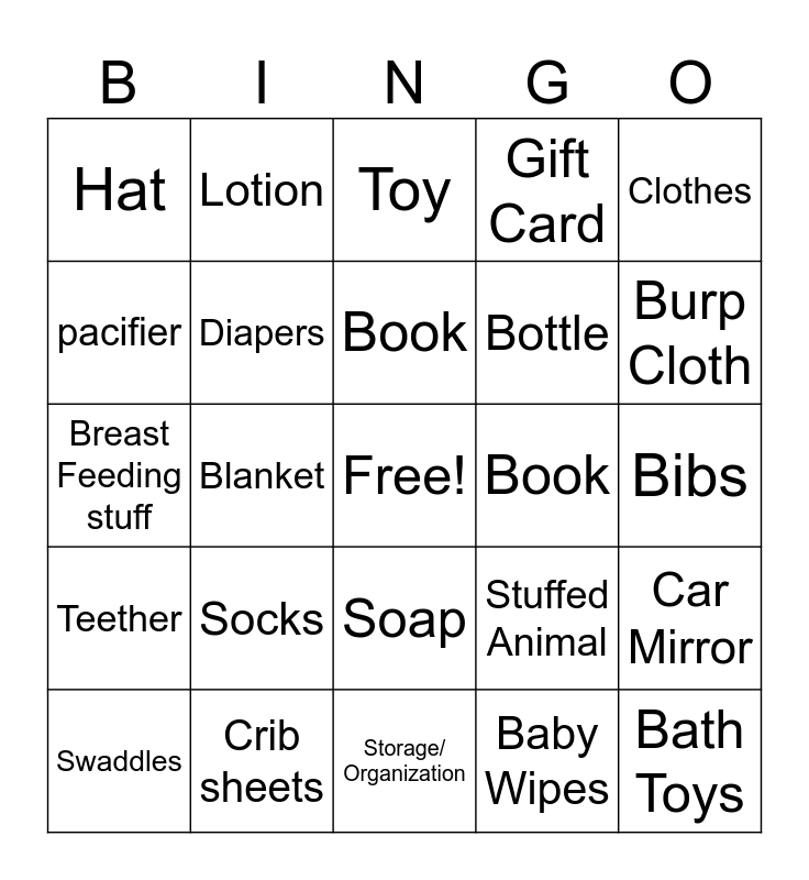 This bingo card has a free space and 24 words: Socks, Crib sheets, Book, Swaddles, Clothes, Hat, pacifier, Lotion, Book, Soap, Bottle, Breast Feeding stuff, Stuffed Animal, Car Mirror, Diapers, Baby Wipes, Bibs, Toy, Burp Cloth, Blanket, Bath Toys, Teether, Gift Card and Storage/ Organization.