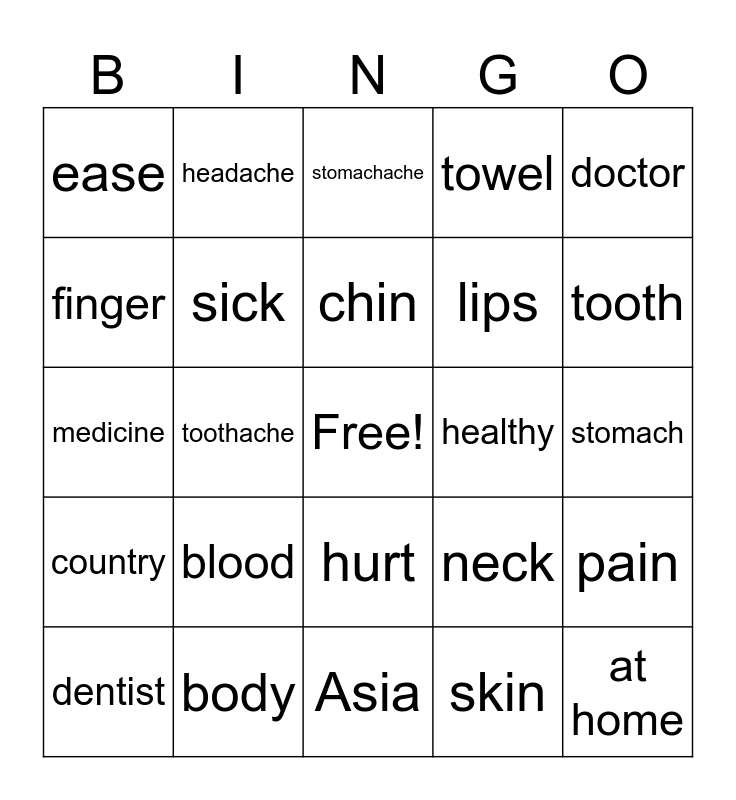 This bingo card has a free space and 24 words: blood, body, chin, dentist, doctor, ease, finger, headache, healthy, hurt, lips, medicine, neck, pain, sick, skin, stomach, stomachache, tooth, toothache, at home, country, towel and Asia.