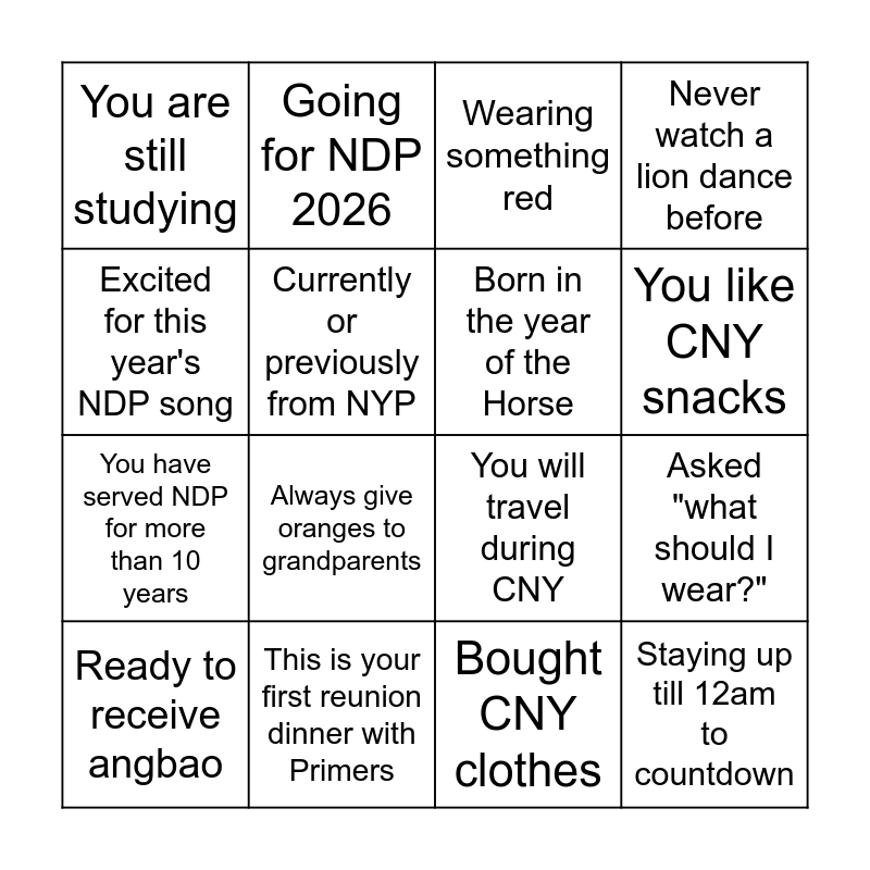 This bingo card has 16 words: This is your first reunion dinner with Primers, Asked "what should I wear?", Wearing something red, You are still studying, You have served NDP for more than 10 years, Going for NDP 2026, You will travel during CNY, Bought CNY clothes, Excited for this year's NDP song, Currently or previously from NYP, Ready to receive angbao, Never watch a lion dance before, Always give oranges to grandparents, You like CNY snacks, Born in the year of the Horse and Staying up till 12am to countdown.
