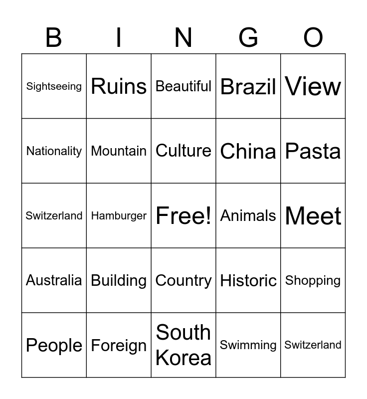 This bingo card has a free space and 24 words: Building, Foreign, Culture, People, View, Sightseeing, Nationality, Ruins, Animals, Country, China, Switzerland, Historic, Shopping, Mountain, Swimming, Meet, Beautiful, Pasta, Hamburger, Switzerland, Australia, Brazil and South Korea.