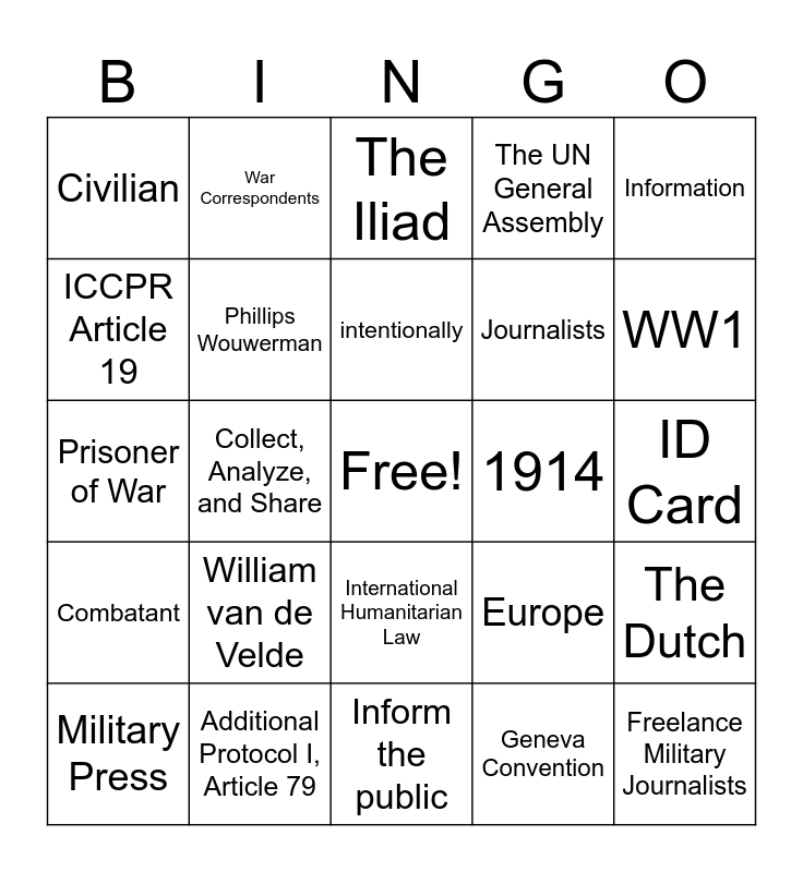 This bingo card has a free space and 26 words: International Humanitarian Law, Geneva Convention, intentionally, Additional Protocol I, Article 79, Information, Civilian, ICCPR Article 19, War Correspondents, ID Card, Europe, Journalists, Prisoner of War, The Dutch, Military Press, Collect, Analyze, and Share, The first "television war", The UN General Assembly, Combatant, The Iliad, Freelance Military Journalists, WW1, Inform the public, 1914, William van de Velde, Phillips Wouwerman and treaties and conventions.