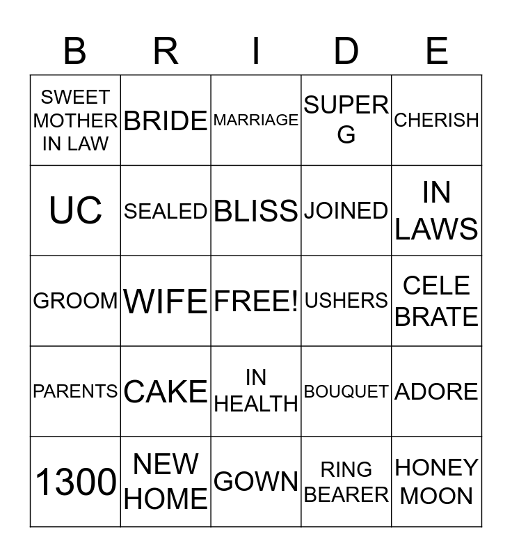 This bingo card has a free space and 24 words: CAKE, NEW HOME, BLISS, 1300, CHERISH, SWEET MOTHER IN LAW, UC, BRIDE, USHERS, IN HEALTH, JOINED, GROOM, BOUQUET, ADORE, SEALED, RING BEARER, CELE BRATE, MARRIAGE, IN LAWS, WIFE, HONEY MOON, PARENTS, SUPER G and GOWN.