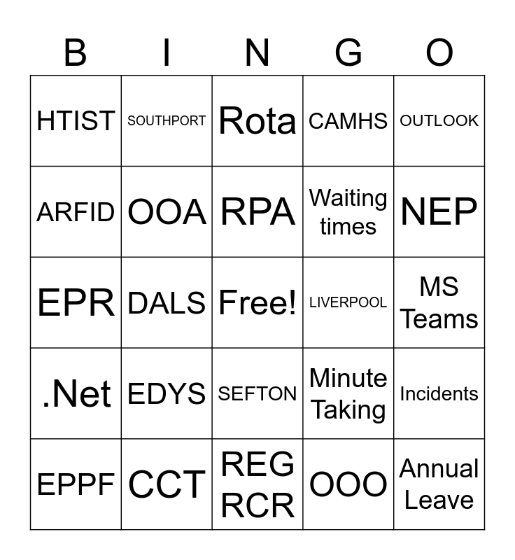 This bingo card has a free space and 24 words: EDYS, CCT, RPA, EPPF, OUTLOOK, HTIST, ARFID, SOUTHPORT, LIVERPOOL, SEFTON, Waiting times, EPR, Minute Taking, Incidents, OOA, OOO, MS Teams, Rota, NEP, DALS, Annual Leave, .Net, CAMHS and REG RCR.