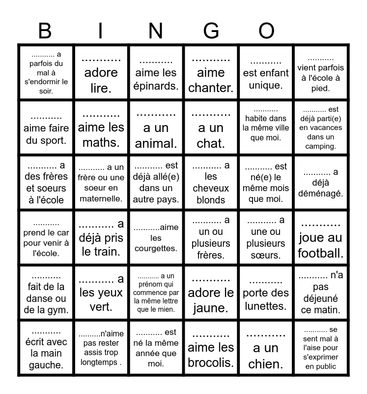 This bingo card has 42 words: ........... a un chien., ........... aime les maths., ........... sait jouer d'un instrument de musique., ........... est né(e) le même mois que moi., ........... joue au football., ........... a déjà pris le train., ........... a des frères et soeurs à l'école, ........... déteste ranger sa chambre., ........... aime les épinards., ........... a déjà déménagé., ........... est déjà allé(e) dans un autre pays., ........... a un chat., ........... est déjà parti(e) en vacances dans un camping., ........... est enfant unique., ..........n'aime pas rester assis trop longtemps ., ........... prend le car pour venir à l'école., ........... n'a pas déjeuné ce matin., ........... habite dans la même ville que moi., ........... se sent mal à l'aise pour s'exprimer en public, ........... adore lire., ........... vient parfois à l'école à pied., ........... a un prénom qui commence par la même lettre que le mien., ........... fait de la danse ou de la gym., ........... a parfois du mal à s'endormir le soir., ........... aime la pizza., ........... écrit avec la main gauche., ........... a un animal., ........... aime dessiner ., ........... a les yeux vert., ........... porte des lunettes., ........... fait souvent du vélo., ........... a les cheveux blonds, ........... aime faire du sport., ........... a une ou plusieurs sœurs., ........... est né la même année que moi., ...........aime les courgettes., ........... a un ou plusieurs frères., ........... a un frère ou une soeur en maternelle., ........... adore le jaune., ........... aime les brocolis., ........... aime chanter. and ........... a une trotinette..