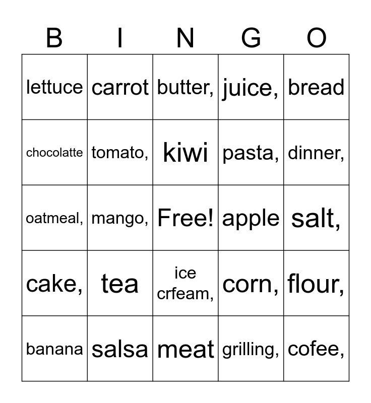 This bingo card has a free space and 24 words: tea, salsa, kiwi, banana, bread, lettuce, chocolatte, carrot, apple, ice crfeam,, pasta,, oatmeal,, corn,, flour,, tomato,, grilling,, salt,, butter,, dinner,, mango,, cofee,, cake,, juice, and meat.