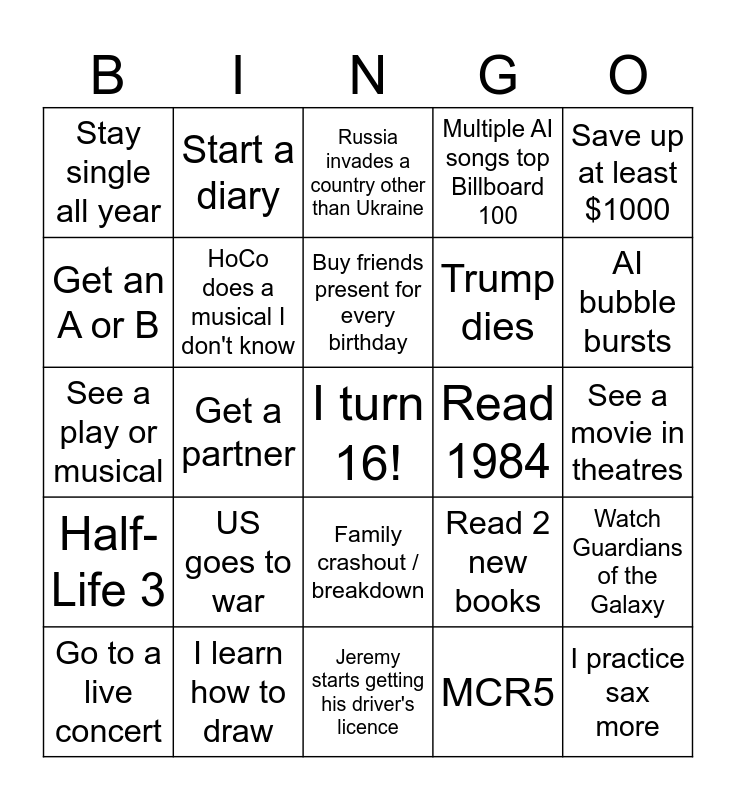 This bingo card has a free space and 24 words: US goes to war, I learn how to draw, Buy friends present for every birthday, Go to a live concert, Save up at least $1000, Stay single all year, Get an A or B, Start a diary, Read 1984, Family crashout / breakdown, Trump dies, See a play or musical, Read 2 new books, Watch Guardians of the Galaxy, HoCo does a musical I don't know, MCR5, See a movie in theatres, Russia invades a country other than Ukraine, AI bubble bursts, Get a partner, I practice sax more, Half-Life 3, Multiple AI songs top Billboard 100 and Jeremy starts getting his driver's licence.