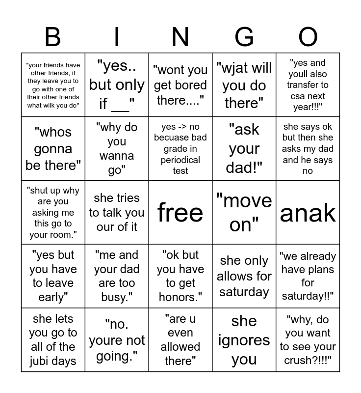 This bingo card has a free space and 24 words: she lets you go to all of the jubi days, "me and your dad are too busy.", yes -> no becuase bad grade in periodical test, she ignores you, "yes and youll also transfer to csa next year!!!", "your friends have other friends, if they leave you to go with one of their other friends what wilk you do", "yes.. but only if __", "wont you get bored there....", "move on", anak, "shut up why are you asking me this go to your room.", "why do you wanna go", she only allows for saturday, "we already have plans for saturday!!", "whos gonna be there", "no. youre not going.", "are u even allowed there", "wjat will you do there", she says ok but then she asks my dad and he says no, "yes but you have to leave early", she tries to talk you our of it, "ok but you have to get honors.", "ask your dad!" and "why, do you want to see your crush?!!!".