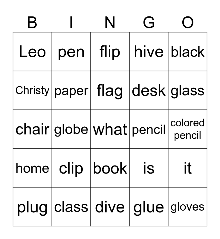 This bingo card has a free space and 24 words: clip, class, flag, plug, black, Leo, Christy, pen, pencil, book, desk, chair, is, it, paper, glue, colored pencil, flip, glass, globe, gloves, home, hive and dive.