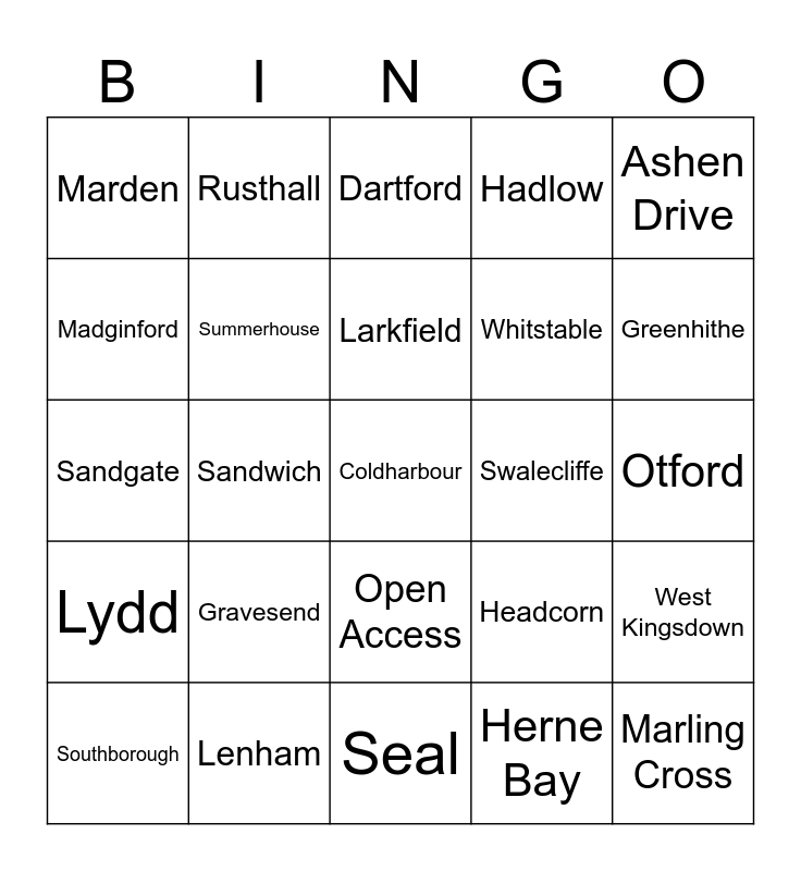 This bingo card has a free space and 104 words: Allington, Ash, Ashen Drive, Ashford, Aylesham, Bearsted, Birchington, Bockhanger, Borough Green, Boughton, Broadstairs, Canterbury, Charing, Cheriton, Coldharbour, Coxheath, Dartford, Dashwood, Deal, Dover, East Peckham, Edenbridge, Faversham, Fleetdown, Folkestone, Gravesend, Greenhithe, Hadlow, Hartley, Hawkhurst, Headcorn, Herne Bay, Higham, Hildenborough, Hive House, Hythe, Kemsing, Kings Farm, Larkfield, Lenham, Longfield, Lydd, Lyminge, Madginford, Maidstone, Marden, Margate, Marling Cross, Meopham, Minster-in-Sheppey, Minster-in-Thanet, Mobile Ashford, Mobile Dover, Mobile Maidstone, Mobile Northfleet, Mobile Sturry, New Ash Green, New Romney, Newington, Open Access, Otford, Paddock Wood, Pembury, Quarry Wood (any), Ramsgate, Riverhead, Riverview Park, Rusthall, Sandgate, Sandwich, Seal, Sevenoaks, Sheerness, Shepway, Sherwood, Showfields, Snodland, Southborough, St Margarets, Stanhope, Staplehurst, Sturry, Summerhouse, Sutton-at-Hone, Swalecliffe, Swanley, Swanscombe, Tenterden, Teynham, Tonbridge, Tonbridge North, Tunbridge Wells, Vigo, West Kingsdown, West Malling, Westerham, Westgate, Whitstable, Wood Avenue, Wye, Yalding, HMP Standford Hill, HMP Swaleside and HMP Elmley.