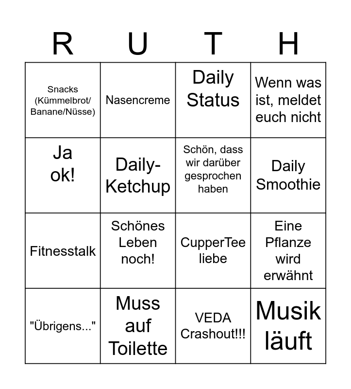 This bingo card has 18 words: Ja ok!, Muss auf Toilette, Daily Status, Wenn was ist, meldet euch nicht, Fitnesstalk, Nasencreme, CupperTee liebe, Daily Smoothie, Snacks (Kümmelbrot/ Banane/Nüsse), Schönes Leben noch!, VEDA Crashout!!!, Eine Pflanze wird erwähnt, "Übrigens...", Daily-Ketchup, Schön, dass wir darüber gesprochen haben, Musik läuft, richtig and Veda crashout.