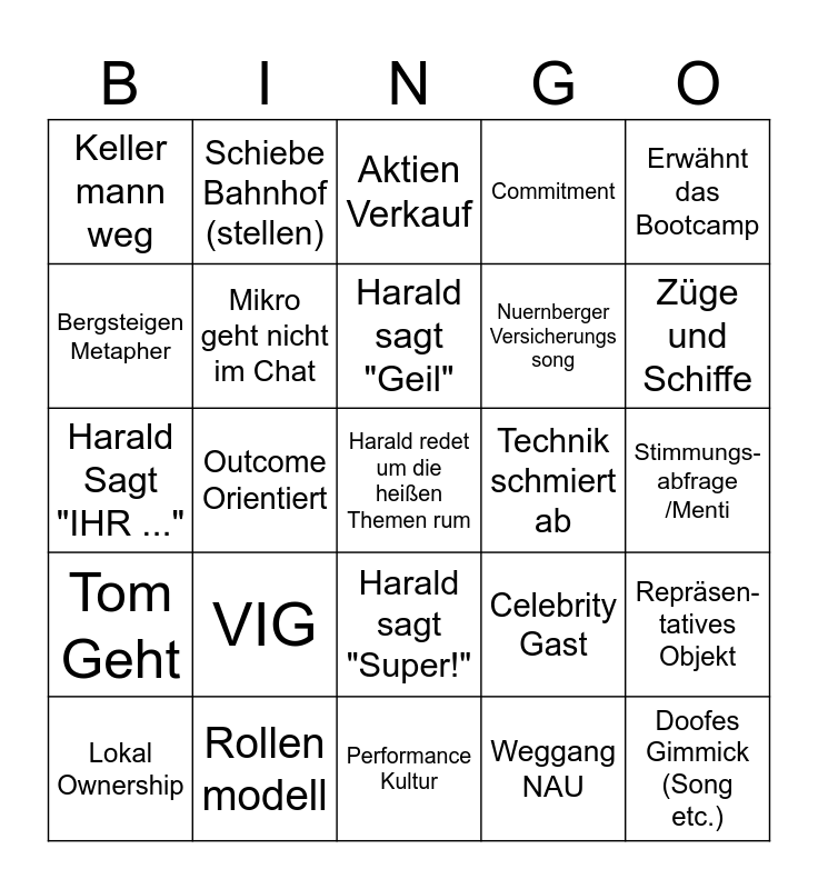 This bingo card has a free space and 29 words: Lokal Ownership, Jahres ziel erreicht, Outcome Orientiert, Neues Motto 8X erwähnt, Keller mann weg, Aktien Verkauf, Mikro geht nicht im Chat, VIG, Technik schmiert ab, Rollen modell, Stimmungs-abfrage /Menti, Doofes Gimmick (Song etc.), Performance Kultur, Weggang NAU, Züge und Schiffe, Interview Format, Harald sagt "Super!", Tom Geht, Erwähnt das Bootcamp, Harald Sagt "IHR ...", Celebrity Gast, Gemalte Roadmap, Nuernberger Versicherungs song, Bergsteigen Metapher, Commitment, Schiebe Bahnhof (stellen), Repräsen-tatives Objekt, Harald sagt "Geil" and Überraschung.