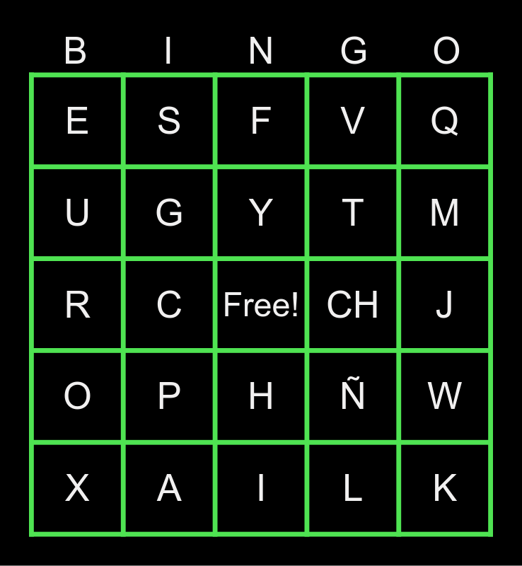 This bingo card has a free space and 30 words: A, B, C, D, E, F, G, H, CH, I, J, K, L, LL, M, N, Ñ, O, P, Q, R, RR, S, T, U, V, W, X, Y and Z.