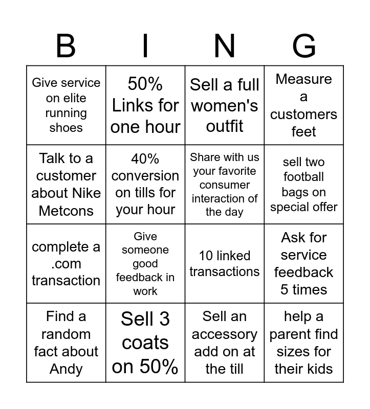 This bingo card has 16 words: Find a random fact about Andy, Sell 3 coats on 50%, Sell a full women's outfit, Measure a customers feet, Talk to a customer about Nike Metcons, 50% Links for one hour, 10 linked transactions, Ask for service feedback 5 times, Give service on elite running shoes, 40% conversion on tills for your hour, Sell an accessory add on at the till, sell two football bags on special offer, complete a .com transaction, Give someone good feedback in work, Share with us your favorite consumer interaction of the day and help a parent find sizes for their kids.