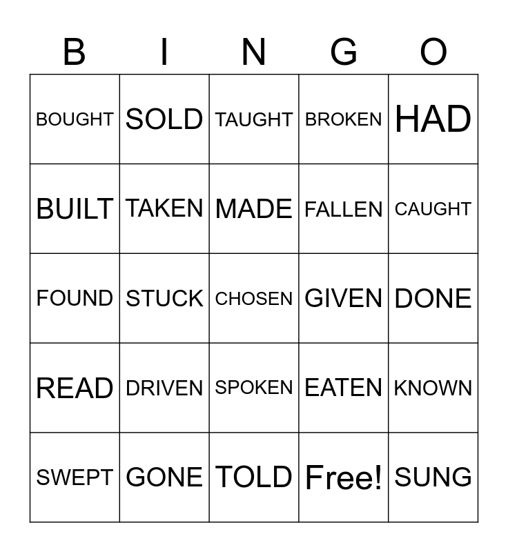This bingo card has 30 words: GONE, WRITTEN, STUCK, SWUM, BOUGHT, TAUGHT, TAKEN, SPOKEN, GIVEN, TOLD, DONE, CHOSEN, Free!, SUNG, CAUGHT, SLEPT, EATEN, READ, DRIVEN, HAD, FOUND, MET, SOLD, FALLEN, BUILT, BROKEN, KNOWN, SWEPT, MADE and LOST.