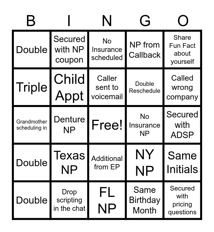 This bingo card has a free space and 24 words: Texas NP, Drop scripting in the chat, Caller sent to voicemail, Double, Share Fun Fact about yourself, Double, Triple, Secured with NP coupon, No Insurance NP, Additional from EP, Double Reschedule, Grandmother scheduling in, NY NP, Same Initials, Child Appt, Same Birthday Month, Secured with ADSP, No Insurance scheduled, Called wrong company, Denture NP, Secured with pricing questions, Double, NP from Callback and FL NP.