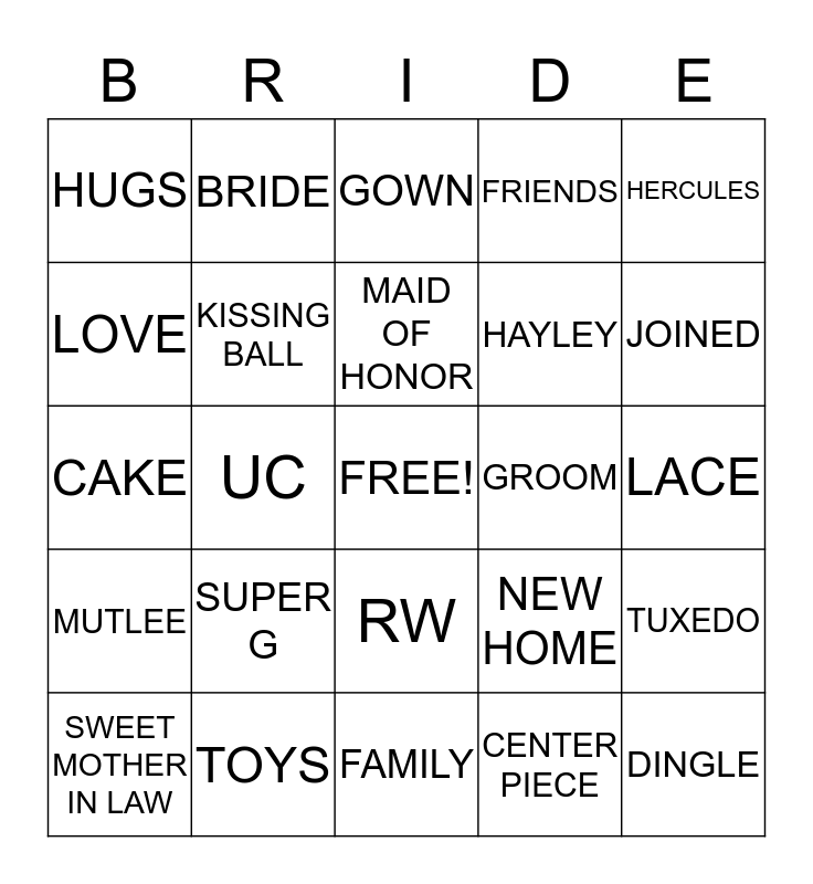 This bingo card has a free space and 24 words: SUPER G, TOYS, MAID OF HONOR, SWEET MOTHER IN LAW, HERCULES, HUGS, LOVE, BRIDE, GROOM, RW, HAYLEY, CAKE, NEW HOME, TUXEDO, KISSING BALL, CENTER PIECE, LACE, GOWN, JOINED, UC, DINGLE, MUTLEE, FRIENDS and FAMILY.