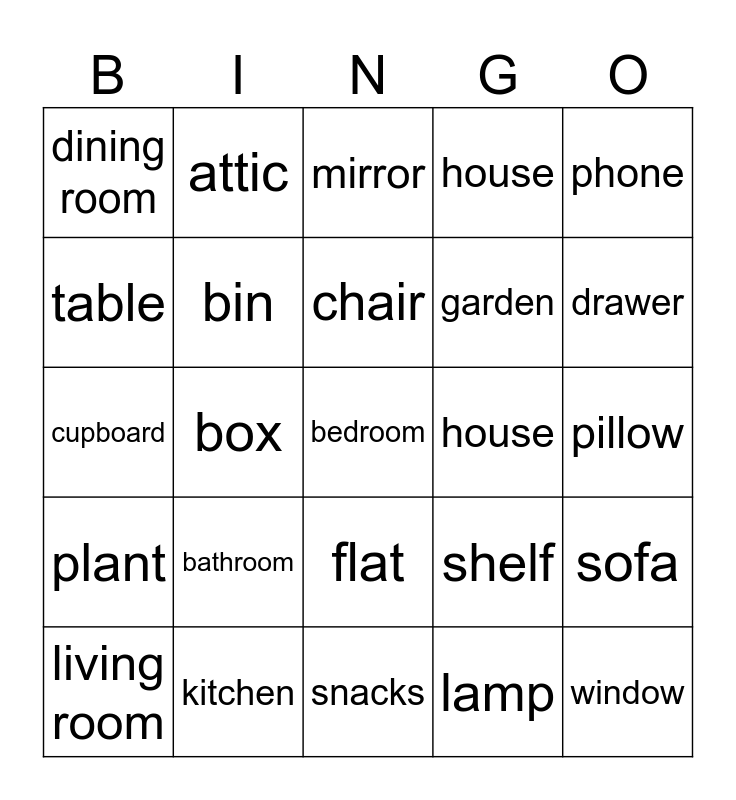 This bingo card has a free space and 24 words: bathroom, kitchen, chair, living room, phone, dining room, table, attic, house, flat, garden, cupboard, shelf, sofa, bin, lamp, pillow, mirror, drawer, box, window, plant, house and snacks.