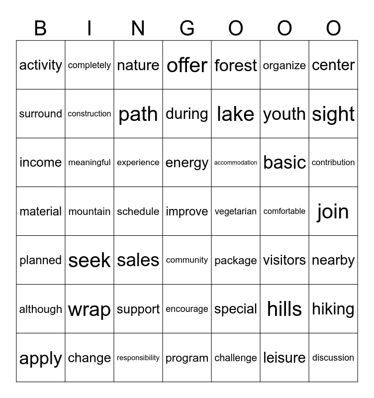 This bingo card has a free space and 48 words: special, youth, program, mountain, experience, join, completely, change, organize, community, center, offer, basic, accommodation, although, comfortable, surround, sight, hills, forest, lake, schedule, activity, construction, hiking, path, contribution, apply, energy, meaningful, leisure, vegetarian, nearby, wrap, material, package, visitors, income, sales, support, planned, discussion, nature, responsibility, during, encourage, seek and challenge.