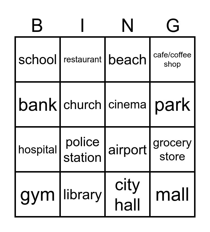 This bingo card has 16 words: library, grocery store, beach, school, hospital, restaurant, airport, city hall, bank, church, gym, cafe/coffee shop, police station, park, cinema and mall.