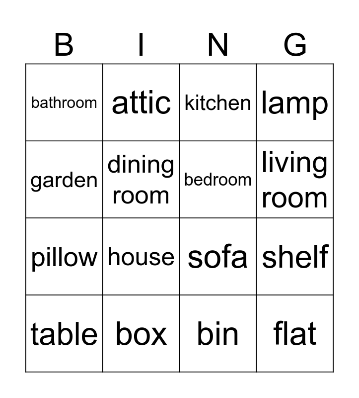 This bingo card has 16 words: box, shelf, kitchen, bathroom, pillow, attic, sofa, bin, garden, dining room, table, lamp, house, living room, bedroom and flat.
