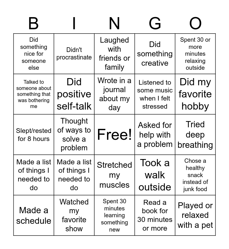 This bingo card has a free space and 24 words: Made a list of things I needed to do, Watched my favorite show, Wrote in a journal about my day, Made a schedule, Spent 30 or more minutes relaxing outside, Did something nice for someone else, Talked to someone about something that was bothering me, Didn't procrastinate, Asked for help with a problem, Stretched my muscles, Listened to some music when I felt stressed, Slept/rested for 8 hours, Took a walk outside, Chose a healthy snack instead of junk food, Did positive self-talk, Read a book for 30 minutes or more, Tried deep breathing, Laughed with friends or family, Did my favorite hobby, Thought of ways to solve a problem, Played or relaxed with a pet, Made a list of things I needed to do, Did something creative and Spent 30 minutes learning something new.