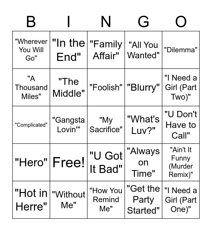 This bingo card has 25 words: Free!, "How You Remind Me", "Foolish", "Hot in Herre", "Dilemma", "Wherever You Will Go", "A Thousand Miles", "In the End", "What's Luv?", "U Got It Bad", "Blurry", "Complicated", "Always on Time", "Ain't It Funny (Murder Remix)", "The Middle", "I Need a Girl (Part One)", "U Don't Have to Call", "Family Affair", "I Need a Girl (Part Two)", "Gangsta Lovin'", "My Sacrifice", "Without Me", "Hero", "All You Wanted" and "Get the Party Started".