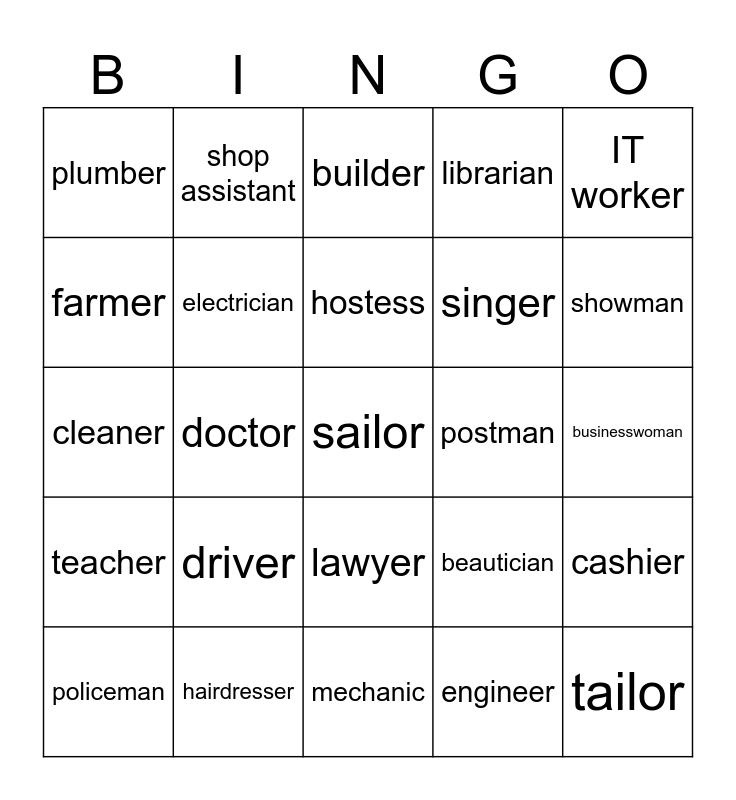 This bingo card has a free space and 29 words: policeman, nurse, doctor, vet, plumber, builder, electrician, driver, postman, hairdresser, businesswoman, tailor, mechanic, engineer, showman, actress, lawyer, teacher, IT worker, cleaner, beautician, writer, singer, farmer, librarian, shop assistant, cashier, hostess and pilot.