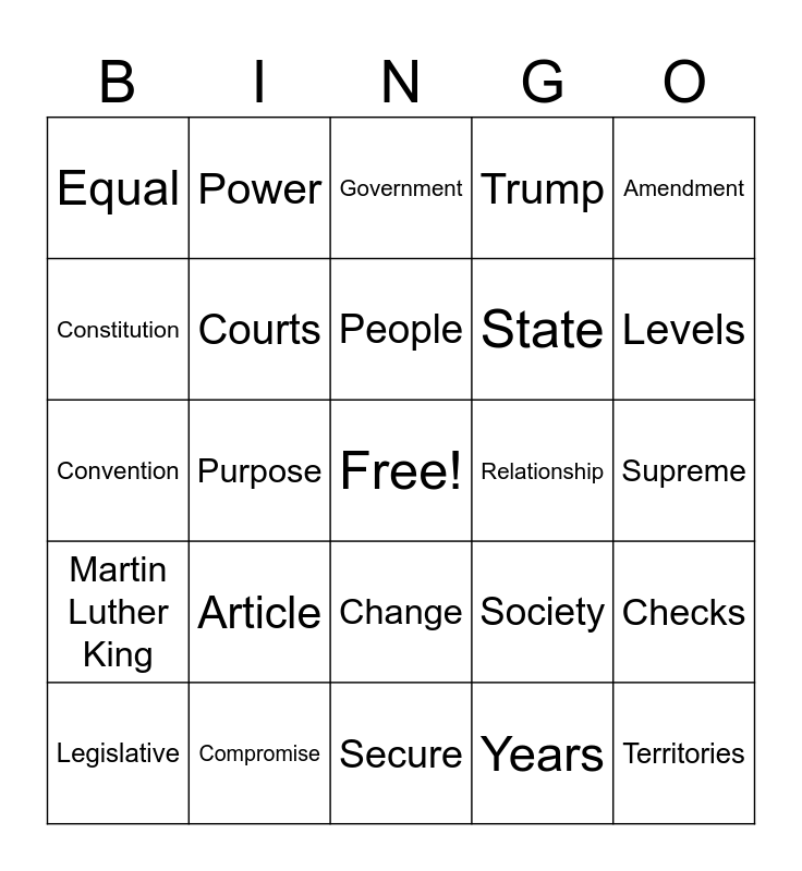 This bingo card has a free space and 24 words: Article, Compromise, People, Legislative, Amendment, Equal, Constitution, Power, Relationship, Change, State, Convention, Society, Checks, Courts, Years, Supreme, Government, Levels, Purpose, Territories, Martin Luther King, Trump and Secure.