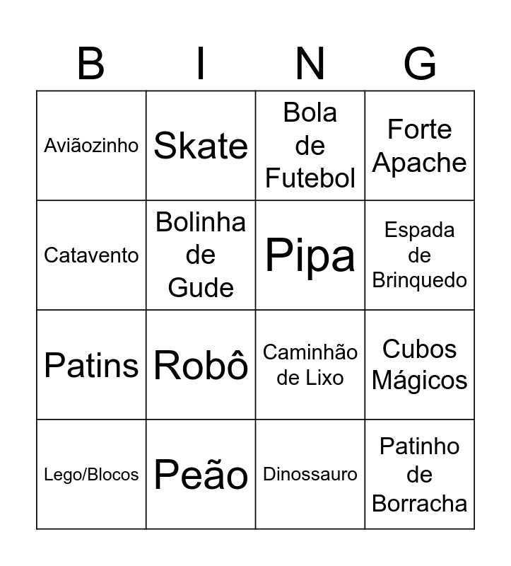 This bingo card has 30 words: Carrinho, Ursinho de Pelúcia, Cubos Mágicos, Trem de Madeira, Aviãozinho, Bola de Futebol, Pipa, Cavalinho de Pau, Peão, Ioiô, Dinossauro, Lego/Blocos, Barquinho, Foguete, Robô, Tambor, Xilofone, Patinho de Borracha, Boneco de Pano, Catavento, Caminhão de Lixo, Trator, Skate, Patins, Bolinha de Gude, Forte Apache, Quebra-cabeça, Dominó, Espada de Brinquedo and Super-herói.