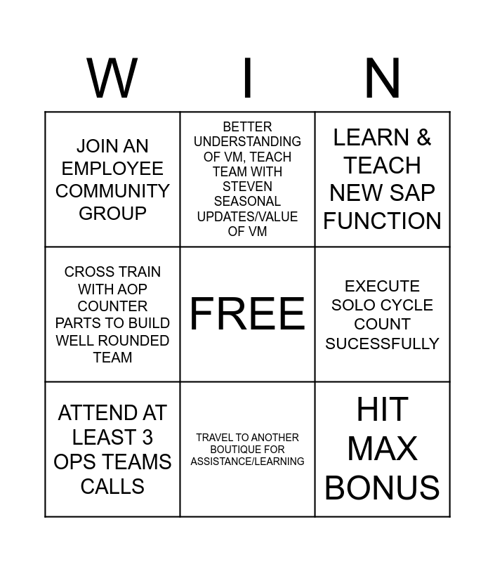 This bingo card has a free space and 8 words: EXECUTE SOLO CYCLE COUNT SUCESSFULLY, LEARN & TEACH NEW SAP FUNCTION, BETTER UNDERSTANDING OF VM, TEACH TEAM WITH STEVEN SEASONAL UPDATES/VALUE OF VM, ATTEND AT LEAST 3 OPS TEAMS CALLS, JOIN AN EMPLOYEE COMMUNITY GROUP, HIT MAX BONUS, CROSS TRAIN WITH AOP COUNTER PARTS TO BUILD WELL ROUNDED TEAM and TRAVEL TO ANOTHER BOUTIQUE FOR ASSISTANCE/LEARNING.