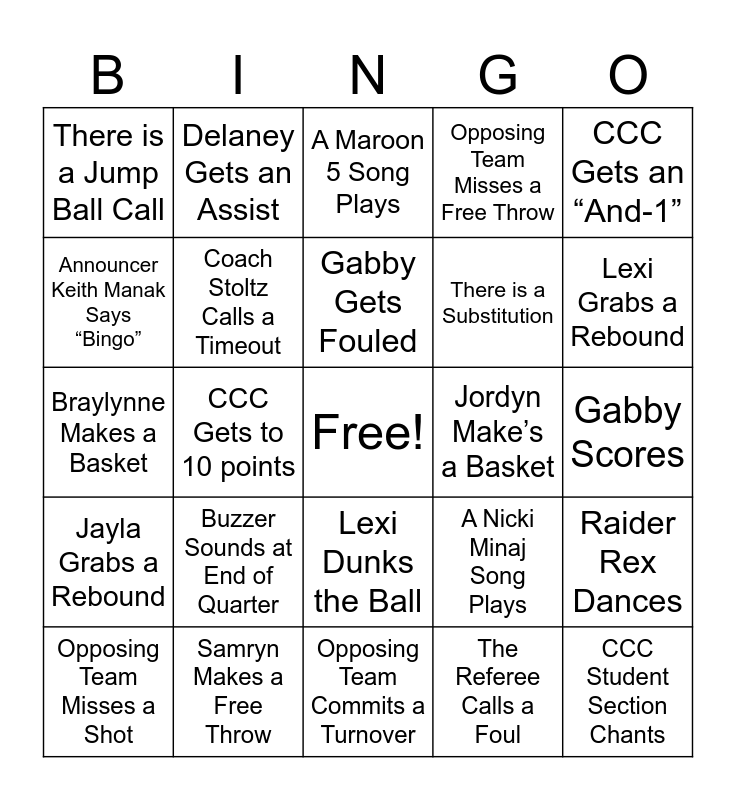 This bingo card has a free space and 27 words: A Nicki Minaj Song Plays, Coach Argon Yells on the Sideline, There is a Substitution, Opposing Team Commits a Turnover, Announcer Keith Manak Says “Bingo”, A Maroon 5 Song Plays, Delaney Gets an Assist, Jayla Grabs a Rebound, Jordyn Make’s a Basket, Raider Rex Dances, Braylynne Makes a Basket, Opposing Team Misses a Free Throw, Opposing Team Misses a Shot, Samryn Makes a Free Throw, Lexi Grabs a Rebound, Opposing Team Commits a Foul, Coach Stoltz Calls a Timeout, Gabby Gets Fouled, Buzzer Sounds at End of Quarter, There is a Jump Ball Call, Gabby Scores, The Referee Calls a Foul, CCC Gets to 10 points, CCC Student Section Chants, Lexi Dunks the Ball, CCC Gets an “And-1” and Caly Makes a 3-Pointer.