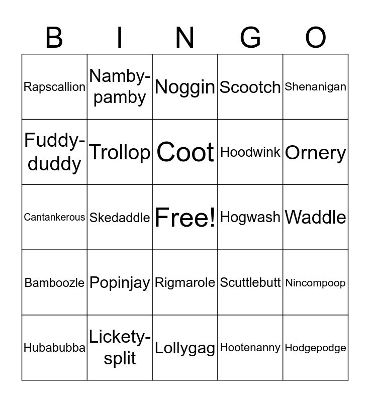 This bingo card has a free space and 24 words: Popinjay, Lickety-split, Coot, Hubabubba, Shenanigan, Rapscallion, Fuddy-duddy, Namby-pamby, Hogwash, Rigmarole, Hoodwink, Cantankerous, Scuttlebutt, Nincompoop, Trollop, Hootenanny, Waddle, Noggin, Ornery, Skedaddle, Hodgepodge, Bamboozle, Scootch and Lollygag.