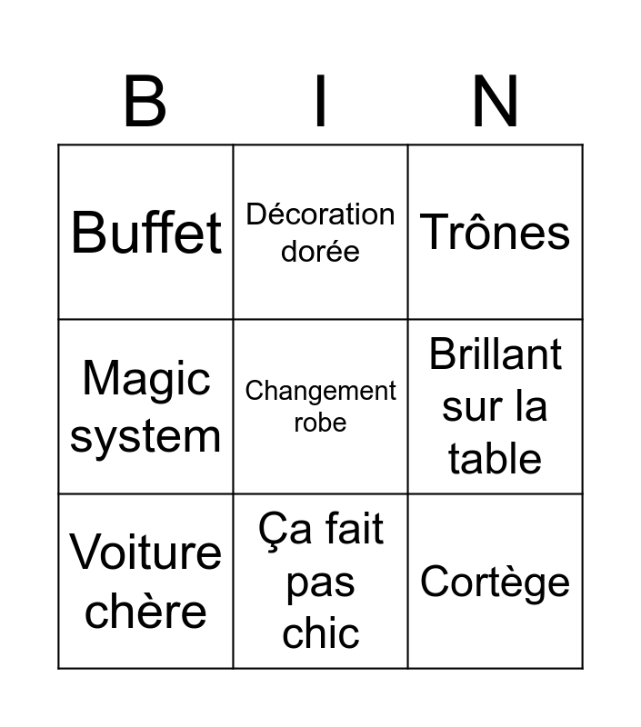 This bingo card has a free space and 8 words: Brillant sur la table, Trônes, Décoration dorée, Voiture chère, Buffet, Cortège, Magic system and Ça fait pas chic.