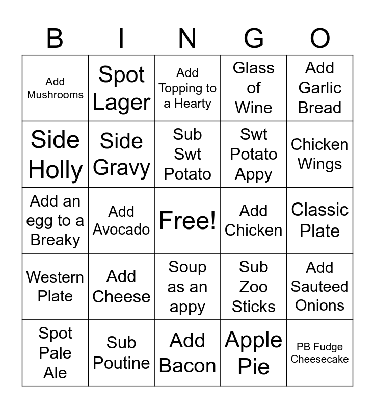 This bingo card has a free space and 24 words: Spot Pale Ale, Add Cheese, Sub Swt Potato, Apple Pie, Add Garlic Bread, Add Mushrooms, Spot Lager, Add Topping to a Hearty, Add Chicken, Classic Plate, Add an egg to a Breaky, Side Gravy, Sub Zoo Sticks, Add Sauteed Onions, Side Holly, Sub Poutine, Add Bacon, Glass of Wine, Chicken Wings, Western Plate, Add Avocado, Soup as an appy, Swt Potato Appy and PB Fudge Cheesecake.