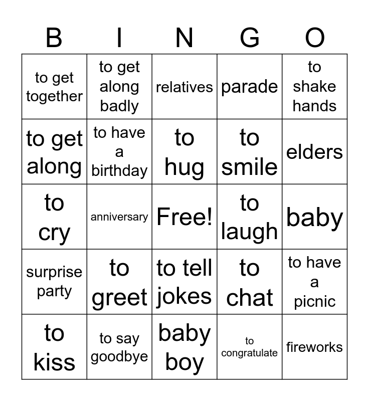 This bingo card has a free space and 24 words: to greet, to say goodbye, to hug, to kiss, to shake hands, to get together, to get along, to get along badly, to laugh, to tell jokes, to smile, to cry, to chat, to have a picnic, to have a birthday, to congratulate, baby, relatives, elders, anniversary, fireworks, surprise party, parade and baby boy.