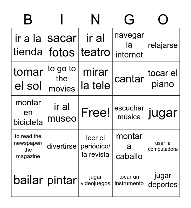 This bingo card has a free space and 29 words: bailar, dibujar, ir al museo, ir al parque, ir a la tienda, ir al teatro, to go to the movies, divertirse, escuchar música, pintar, jugar, jugar deportes, jugar videojuegos, tocar un instrumento, tocar el piano, leer, leer el periódico/ la revista, to read the newspaper/ the magazine, relajarse, montar en bicicleta, montar a caballo, coser, cantar, tomar el sol, navegar la internet, sacar fotos, usar la computadora, mirar la tele and escribir.