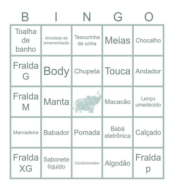 This bingo card has a free space and 35 words: Aspirador nasal, Sabonete em barra, Termômetro, Body, Pomada, Meias, Fralda G, Canguru, Chupeta, Lençol, Fralda M, Chocalho, Pano de boca, Escova de cabelo, Toalha de banho, Macacão, Algodão, Manta, Mamadeira, Fralda p, Babá eletrônica, Fralda XG, Calçado, Sabonete líquido, Tesourinha de unha, Andador, Cotonete, Roupinha, Touca, Lenço umedecido, Cueiro, Condicionador, Babador, Almofada de amamentação and Shampoo.