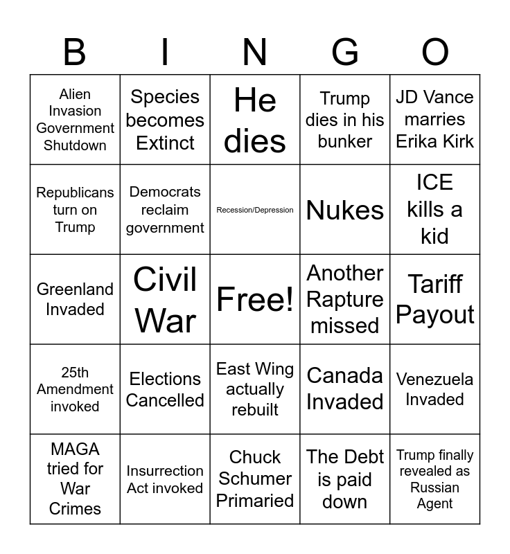 This bingo card has a free space and 24 words: Elections Cancelled, Insurrection Act invoked, Recession/Depression, MAGA tried for War Crimes, JD Vance marries Erika Kirk, Alien Invasion Government Shutdown, Republicans turn on Trump, Species becomes Extinct, Another Rapture missed, East Wing actually rebuilt, Nukes, Greenland Invaded, Canada Invaded, Venezuela Invaded, Democrats reclaim government, The Debt is paid down, Tariff Payout, He dies, ICE kills a kid, Civil War, Trump finally revealed as Russian Agent, 25th Amendment invoked, Trump dies in his bunker and Chuck Schumer Primaried.