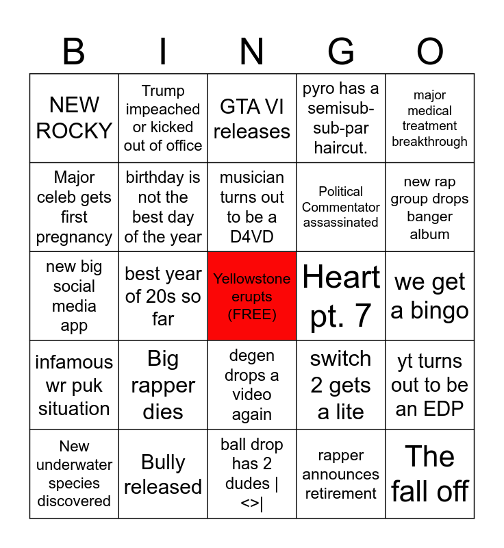 This bingo card has a free space and 24 words: Big rapper dies, Bully released, musician turns out to be a D4VD, New underwater species discovered, major medical treatment breakthrough, NEW ROCKY, Major celeb gets first pregnancy, Trump impeached or kicked out of office, Heart pt. 7, degen drops a video again, Political Commentator assassinated, new big social media app, switch 2 gets a lite, yt turns out to be an EDP, birthday is not the best day of the year, rapper announces retirement, we get a bingo, GTA VI releases, new rap group drops banger album, best year of 20s so far, The fall off, infamous wr puk situation, pyro has a semisub-sub-par haircut. and ball drop has 2 dudes |<>|.