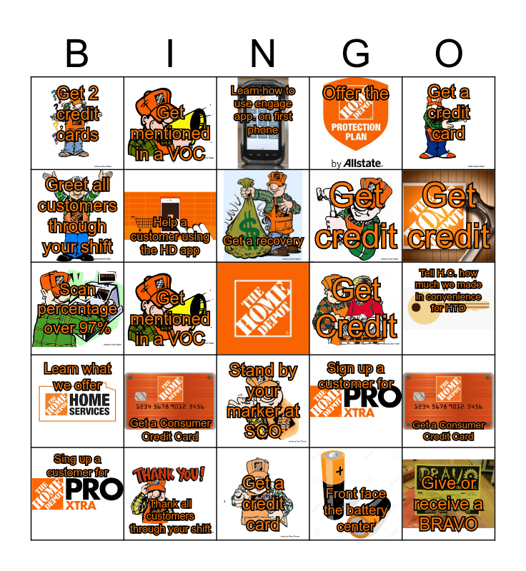 This bingo card has 24 images, a free space and 24 words: Get a Consumer Credit Card, Thank all customers through your shift, Get a recovery, Sing up a customer for, Get a credit card, Get 2 credit cards, Greet all customers through your shift, Get mentioned in a VOC, Get Credit, Stand by your marker at SCO, Get credit, Scan percentage over 97%, Sign up a customer for, Get a Consumer Credit Card, Help a customer using the HD app, Front face the battery center, Tell H.C. how much we made in convenience for HTD, Learn how to use engage app. on first phone, Get credit, Get mentioned in a VOC, Give or receive a BRAVO, Learn what we offer, Offer the and Get a credit card.