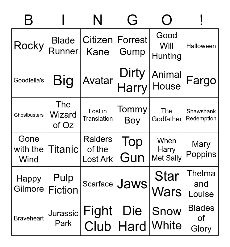 This bingo card has 76 words: A Few Good Men, Blades of Glory, Citizen Kane, Beetlejuice, Edward Scissorhands, Breakfast Club, Die Hard, Alien, Fight Club, Gladiator, Happy Gilmore, Back to the Future, Big, Halloween, Caddy Shack, Fargo, Jaws, Ghostbusters, Free!, Good Will Hunting, Jurassic Park, Animal House, Goodfella's, Blade Runner, Forrest Gump, Annie Hall, Hunger Games, Joker, Ferris Bueller’s Day Off, Casablanca, Braveheart, ET, Ben Hur, Gone with the Wind, Dirty Harry, Avatar, Karate Kid, The Lord of the Rings, Lost in Translation, Mary Poppins, Monty Python and the Holy Grail, Mrs. Doubtfire, Office Space, On Golden Pond, One Flew Over the Cukoo's Nest, Pulp Fiction, Raiders of the Lost Ark, Rocky, Romancing the Stone, Saving Private Ryan, Scarface, Shawshank Redemption, Silence of the Lambs, Snow White, Sound of Music, Stand by Me, Star Wars, Taxi Driver, The Big Lebowski, The Exorcist, The Godfather, The Good, Bad and the Ugly, The Graduate, The Jerk, The Shining, The Sting, The Wizard of Oz, Thelma and Louise, This is Spinal Tap, Throw Mama from the Train, Titanic, Tommy Boy, Top Gun, Toy Story, When Harry Met Sally and Young Frankenstein.