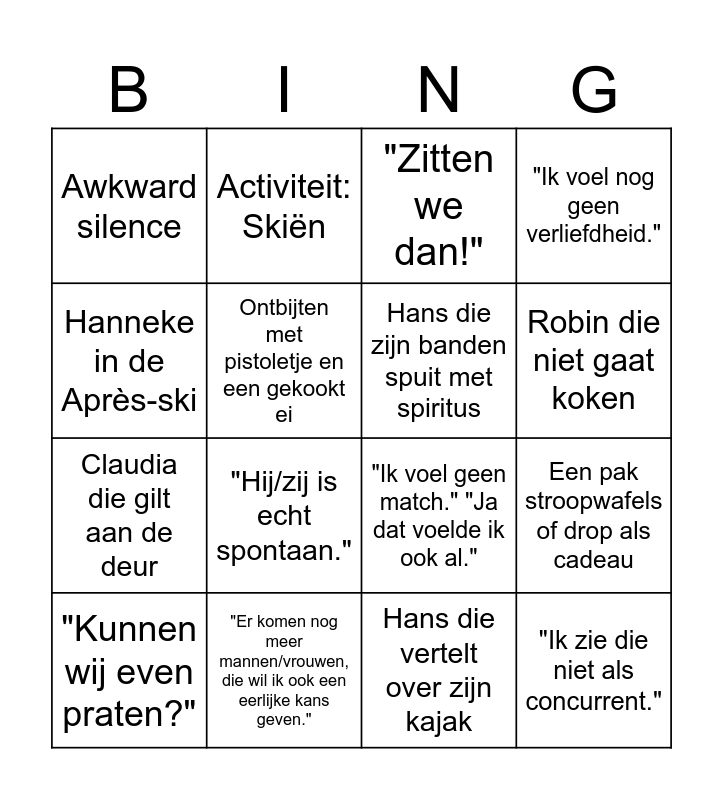 This bingo card has 18 words: "Hij/zij is echt spontaan.", "Ik zie die niet als concurrent.", "Zitten we dan!", Awkward silence, "Ik voel geen match." "Ja dat voelde ik ook al.", "Ik voel nog geen verliefdheid.", "Kunnen wij even praten?", Activiteit: Skiën, Robin die niet gaat koken, Claudia die gilt aan de deur, Hans die vertelt over zijn kajak, Hanneke in de Après-ski, Een pak stroopwafels of drop als cadeau, Ontbijten met pistoletje en een gekookt ei, Hans die zijn banden spuit met spiritus, Iemand verwijst naar een ander met "het", "Er komen nog meer mannen/vrouwen, die wil ik ook een eerlijke kans geven." and "Je voelt hem al wel aankomen hè.".