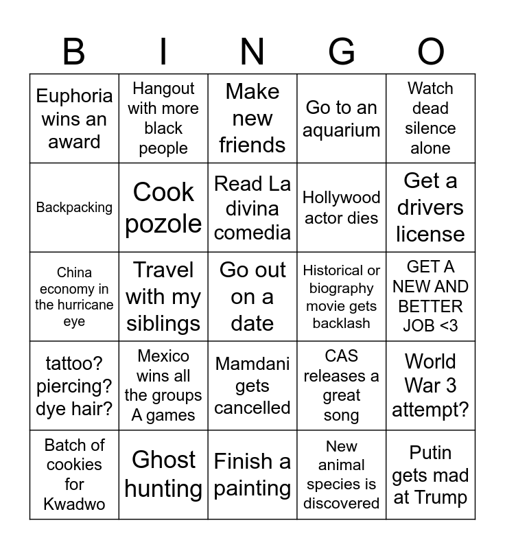 This bingo card has a free space and 24 words: Mexico wins all the groups A games, Ghost hunting, Read La divina comedia, Batch of cookies for Kwadwo, Watch dead silence alone, Euphoria wins an award, Backpacking, Hangout with more black people, Historical or biography movie gets backlash, Mamdani gets cancelled, Hollywood actor dies, China economy in the hurricane eye, CAS releases a great song, World War 3 attempt?, Cook pozole, New animal species is discovered, GET A NEW AND BETTER JOB <3, Make new friends, Get a drivers license, Travel with my siblings, Putin gets mad at Trump, tattoo? piercing? dye hair?, Go to an aquarium and Finish a painting.