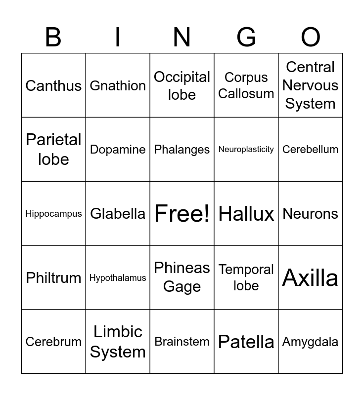This bingo card has a free space and 29 words: Cerebrum, Thalamus, Glabella, Frontal lobe, Canthus, Occipital lobe, Dopamine, Hypothalamus, Hallux, Limbic System, Neurons, Amygdala, Brainstem, Patella, Cerebellum, Clavicle, Phineas Gage, Philtrum, Central Nervous System, Hippocampus, Temporal lobe, Pituitary Gland, Neuroplasticity, Parietal lobe, Corpus Callosum, Gnathion, Axilla, Phalanges and Lunula.