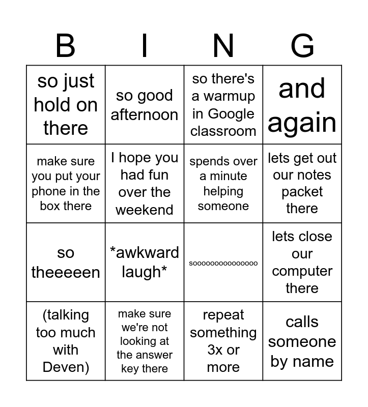 This bingo card has 16 words: make sure we're not looking at the answer key there, lets close our computer there, so there's a warmup in Google classroom, so just hold on there, so theeeeen, so good afternoon, sooooooooooooooo, repeat something 3x or more, make sure you put your phone in the box there, I hope you had fun over the weekend, (talking too much with Deven), and again, *awkward laugh*, lets get out our notes packet there, spends over a minute helping someone and calls someone by name.